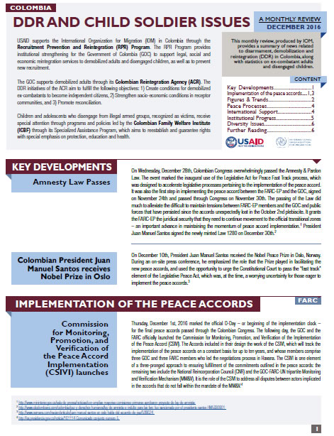 USAID supports the International Organization for Migration (IOM) in Colombia through the Recruitment Prevention and Reintegration (RPR) Program. The RPR Program provides institutional strengthening for the Government of Colombia (GOC) to support legal, social and economic reintegration services to demobilized adults and disengaged children, as well as to prevent new recruitment. The GOC supports demobilized adults through its Colombian Reintegration Agency (ACR). The DDR initiatives of the ACR aim to fulfill the following objectives: 1) Create conditions for demobilized ex-combatants to become independent citizens, 2) Strengthen socio-economic conditions in receptor communities, and 3) Promote reconciliation. Children and adolescents who disengage from illegal armed groups, recognized as victims, receive special attention through programs and policies led by the Colombian Family Welfare Institute (ICBF) through its Specialized Assistance Program, which aims to reestablish and guarantee rights with special emphasis on protection, education and health.