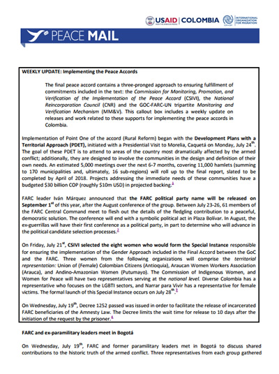 President Juan Manuel Santos announced Friday, March 17th, that the FARC-EP arms inventory comprises 14,000 arms, roughly 11,000 of which are rifles. Incarcerated members of the public forces who have served at least five years of their sentence, and who were found guilty of crimes within the framework of the armed conflict may be eligible for early release as long as they were not convicted of crimes covered in the Rome Statute or under International Humanitarian Law. Two more minors released from the FARC-EP transitional zones. FARC-EP dissident bloc demobilizes in Caquetá.